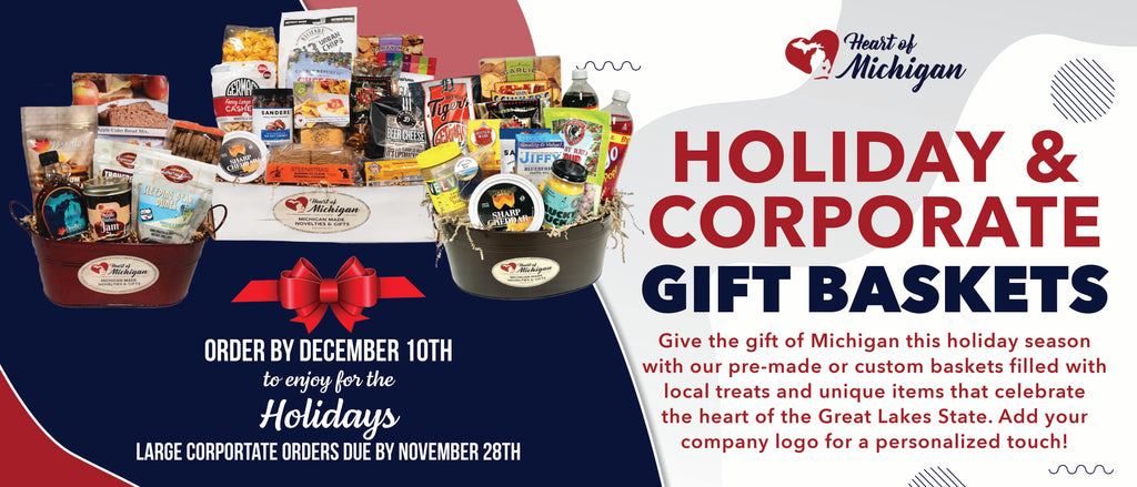 Our featured gift baskets are full of products Made in Michigan. Gift baskets can be for any occasion, for yourself, family, or friend. We also offer to "Build Your Own" gift box, tin or crate. Heart of Michigan can also accommodate large corporate gift baskets orders of any size!
