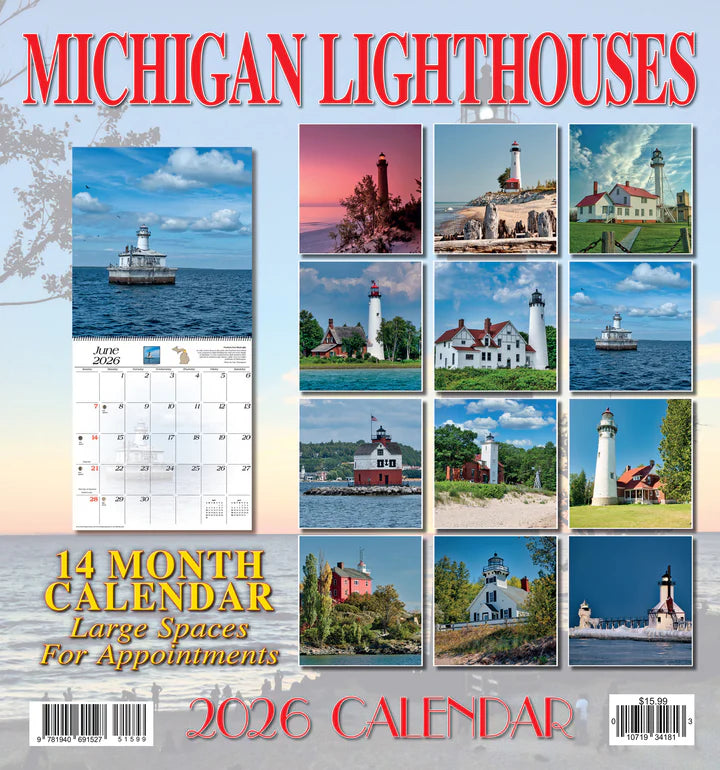 The 2026 Michigan Lighthouses calendar features Michigan's beautiful lighthouses in all seasons! For durability, this calendar features heavy card-stock pages and metal spiral binding.