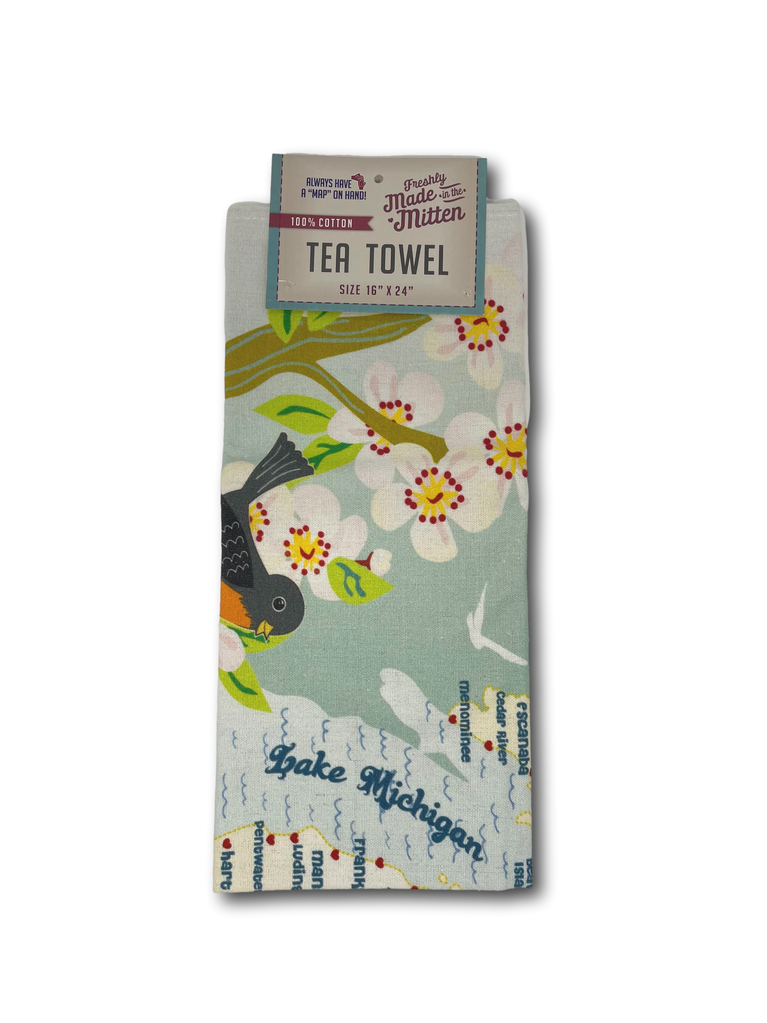 Retro style artwork with hearts adorning many of Michigan's lovely cities. Each tea towel measures 16 x 24 inches and is 100% cotton. Hang your tea towel as art or use it in the kitchen to dry dishes.