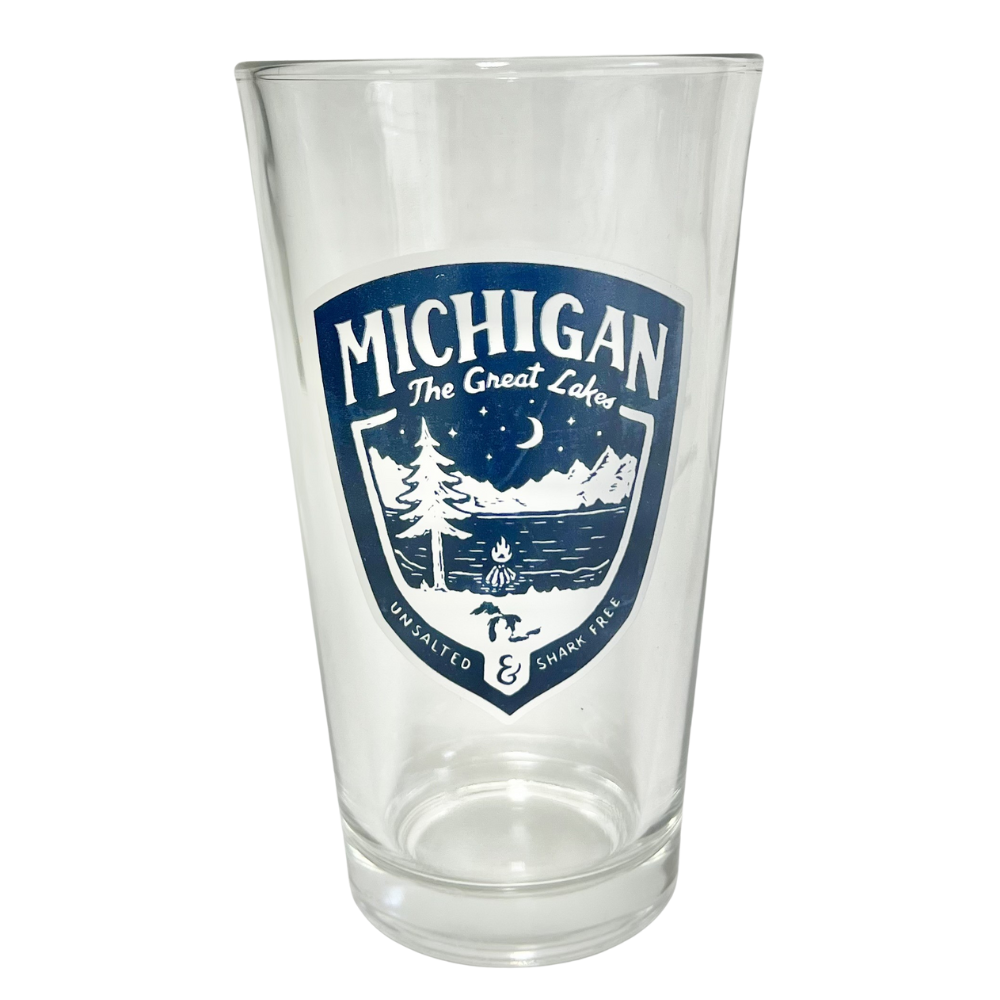 Pint glass with The Great Lakes badge icon on the front, "Michigan" in stylized text and lakeside camp-side art.
