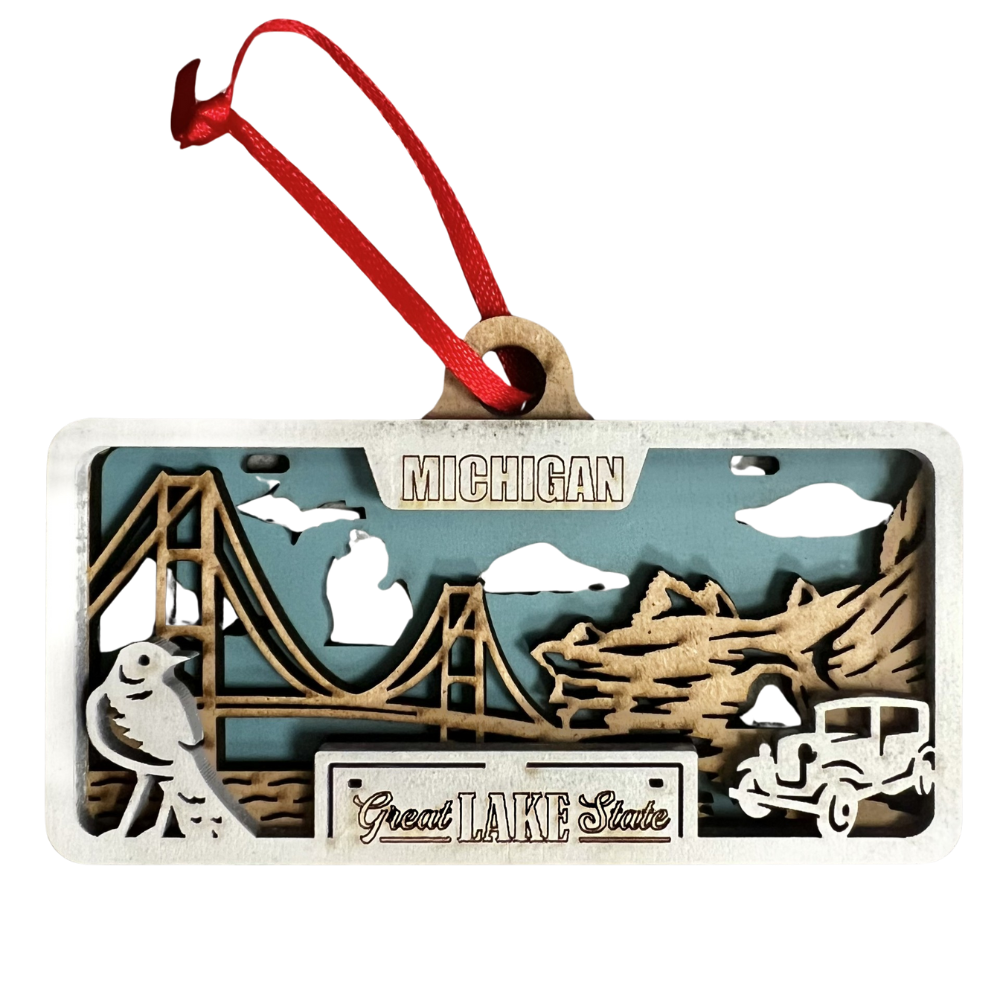 Our etched wood Michigan License Plate ornament features iconic images from the state. Perfect for any Michigander (or one at heart). Pre-strung with ribbon or twine and ready to hang!