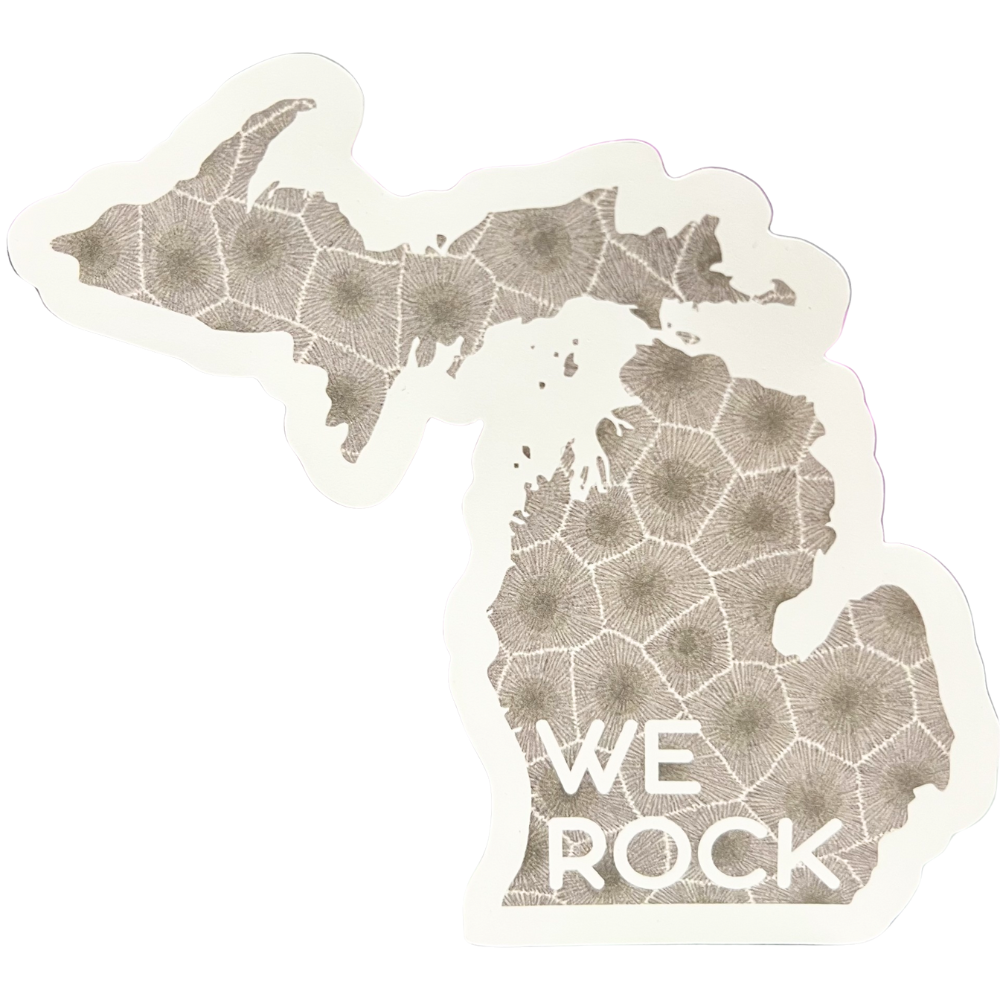 Expertly crafted for true Michigan fans, this "We Rock" decal features the state's iconic Petoskey stone pattern. Measuring roughly 4x4 inches, it adds a touch of state pride to any surface. Made for lasting durability, show your love for the Great Lakes State with this unique decal.
