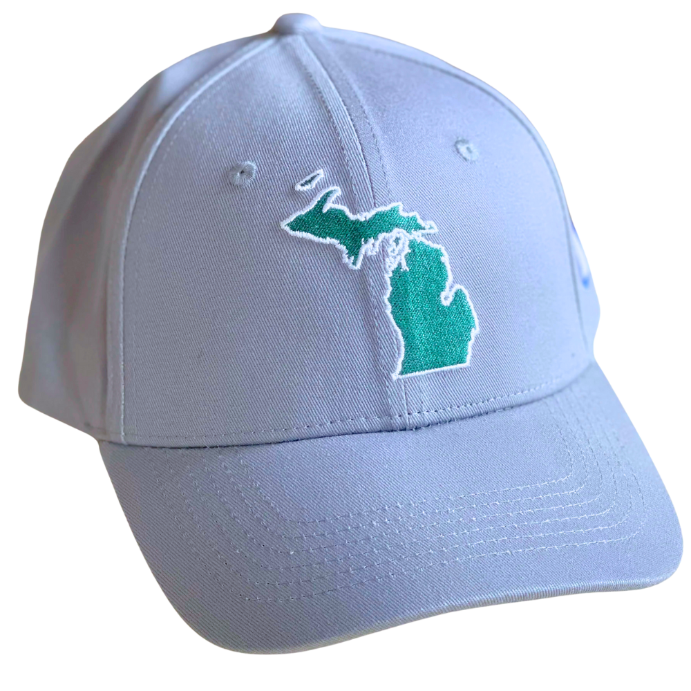 Rock your state pride with this Green & White State of Michigan Grey Ball Cap! Subtly show off your spartan love while staying stylish. Perfect for game days or everyday wear.