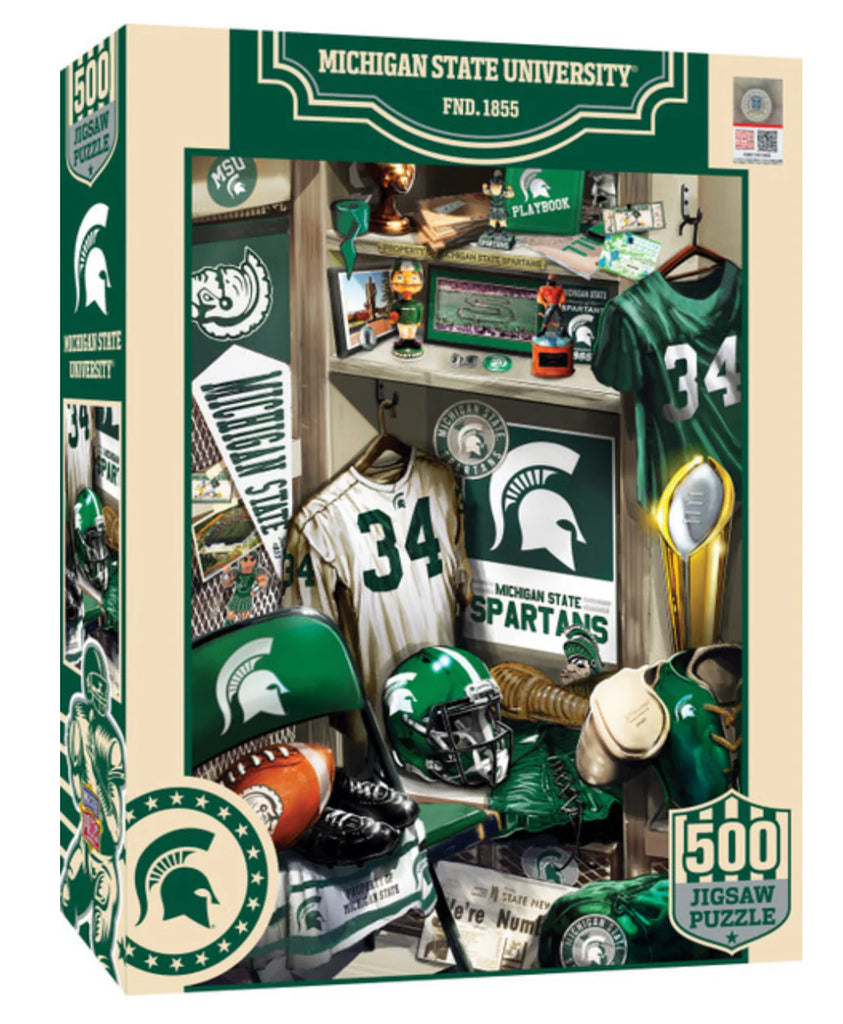 Take a nostalgic walk back through Michigan State® football history with original art that masterfully showcases memorabilia from years past. In addition to the iconic jerseys and helmet, several noteworthy pieces of Spartans™ football history are featured in this unique puzzle. To reduce its impact on our environment, the chipboard used in this puzzle is made of recycled material.
