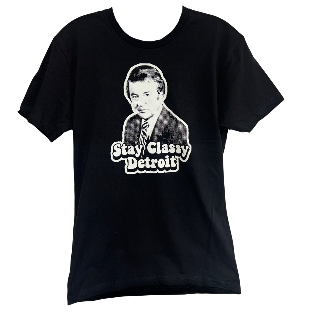 Celebrate a Detroit broadcasting legend with this Bill Bonds black T-Shirt, featuring his iconic image alongside the phrase "Stay Classy Detroit." Known for his impactful career as a news anchor and reporter at WXYZ-TV, this shirt honors his enduring influence on local journalism. Crafted for fans who appreciate Detroit’s media history, it combines comfort with a tribute to a respected figure in American television news.