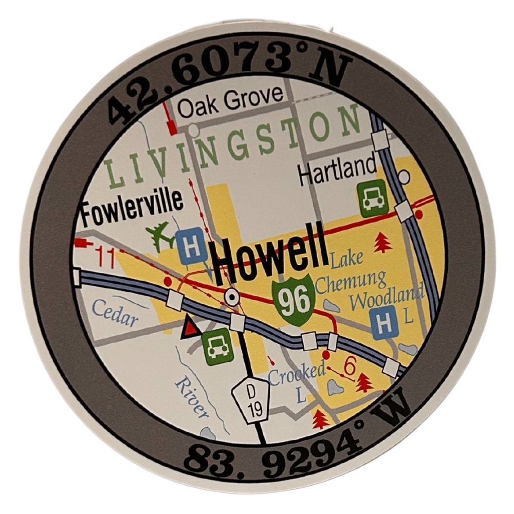 Decal with map of Howell and coordinates. Decal for vehicles, outdoors, etc.