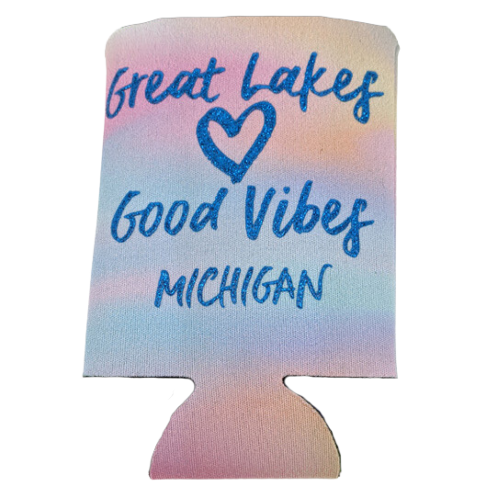 Feel good vibes with our flat can cooler featuring "Great Lakes Good Vibes Michigan" art in a glittery blue ink! Background is a calming, soft sherbet color swirl.