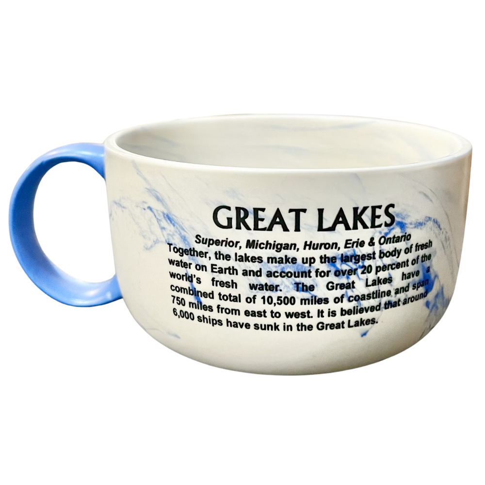 Crafted with precision, this blue and white marbled ceramic soup mug showcases an illustration of the Great Lakes alongside fascinating geographical facts. The generous size provides ample space for hearty soups while the durable construction ensures heat retention. Perfect for educational institutions, lake enthusiasts, or anyone with an appreciation for the magnificent Great Lakes region.