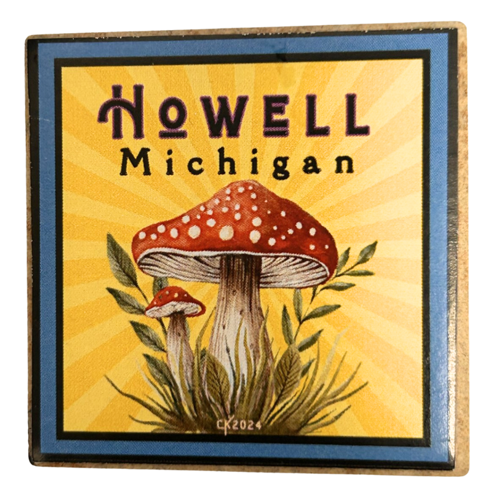 Handmade with love- Howell, Michigan Mushroom art tile magnet with yellow background.