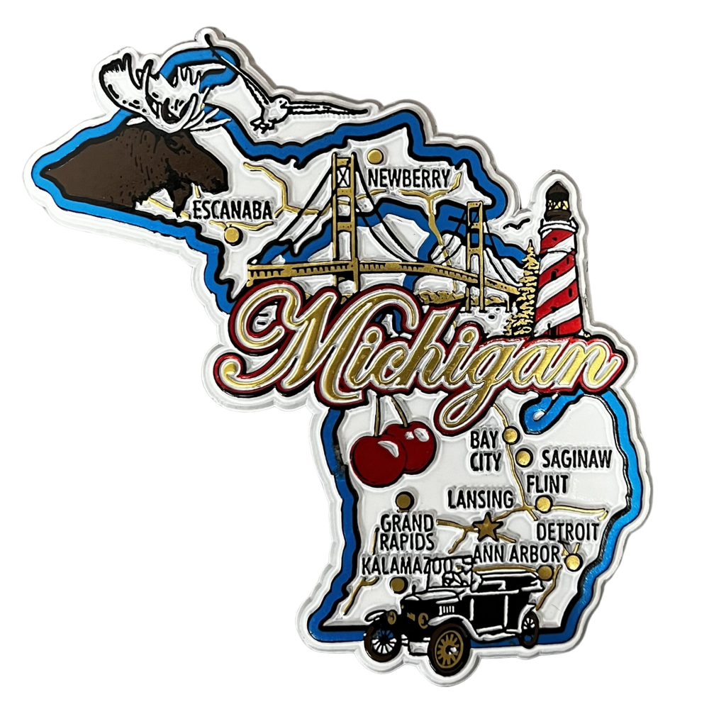 This flexible refrigerator magnet features Michigan's highways and iconic images.