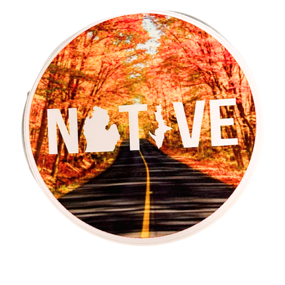 Native decal with upper and lower peninsula and fall trees background. Decal for vehicles, outdoors, etc.