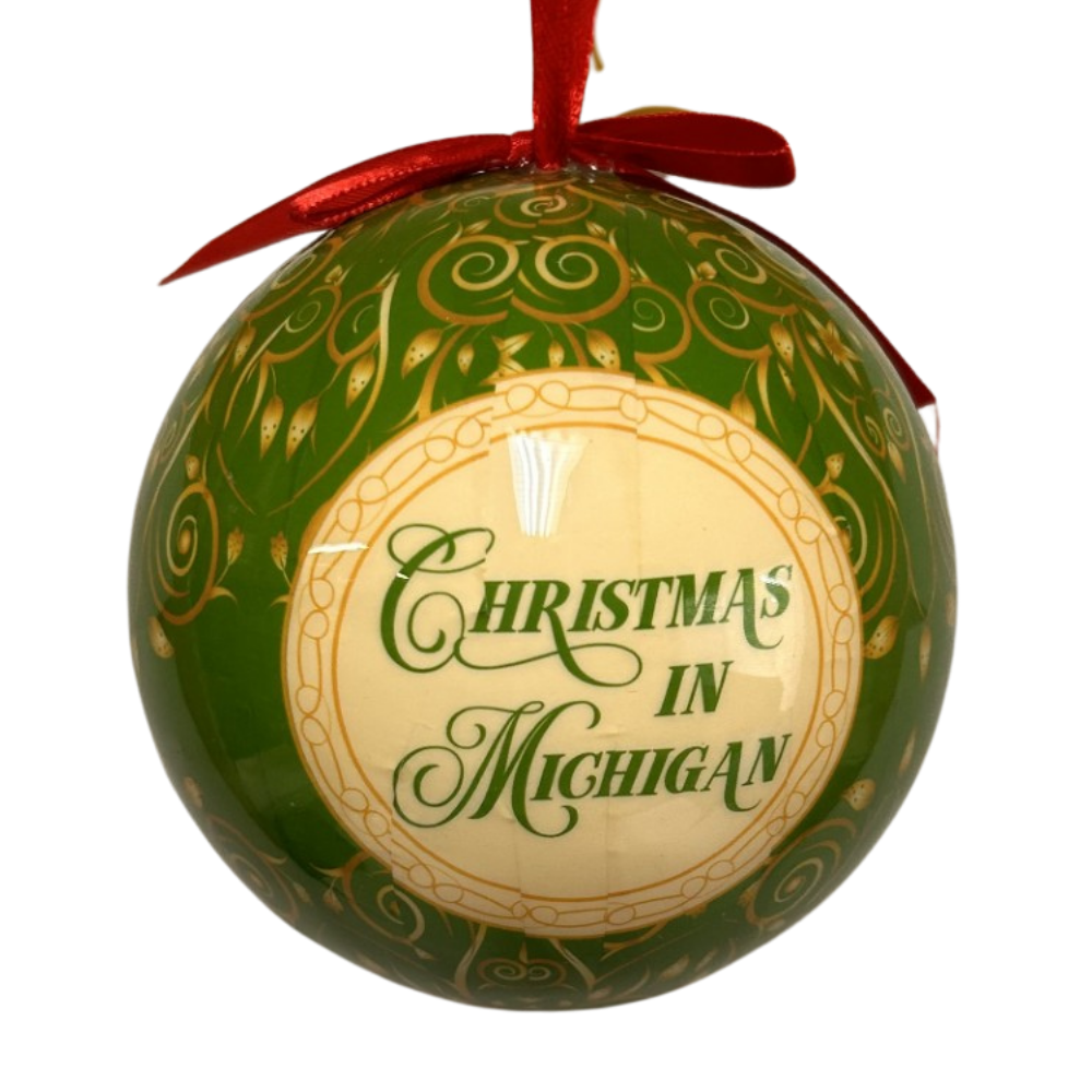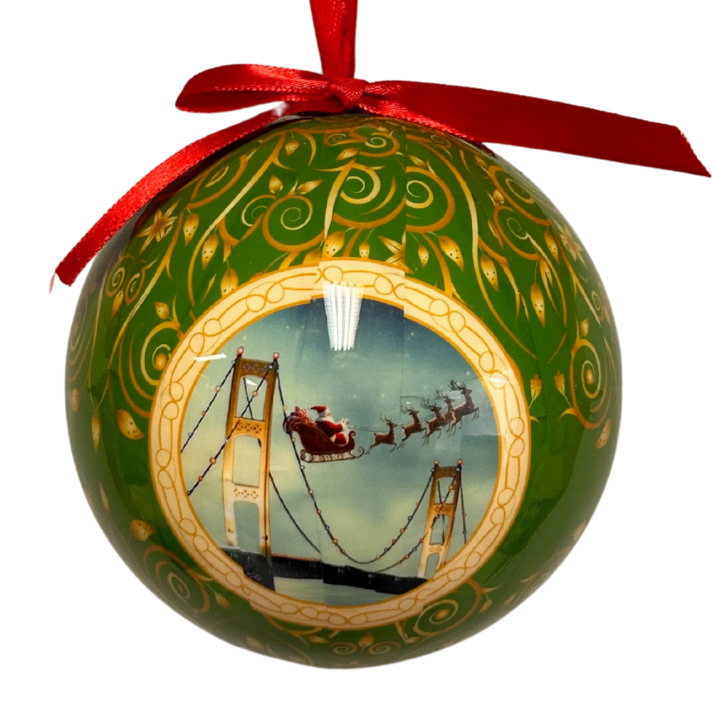 Classic Christmas bulb ornament with Mackinac Bridge scene and Santa flying in sleigh with reindeer. "Christmas in Michigan" on the front in script.