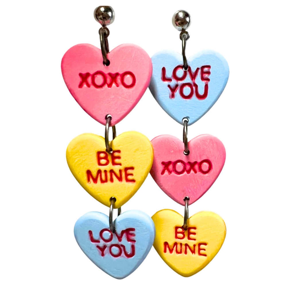 Add a splash of fun to your look with these handmade Conversation Heart Clay Dangle Earrings. Crafted from polymer clay, each earring features three colorful tiers that sway playfully with every move. Lightweight and unique, they’re perfect for brightening up any outfit and sparking smiles wherever you go.